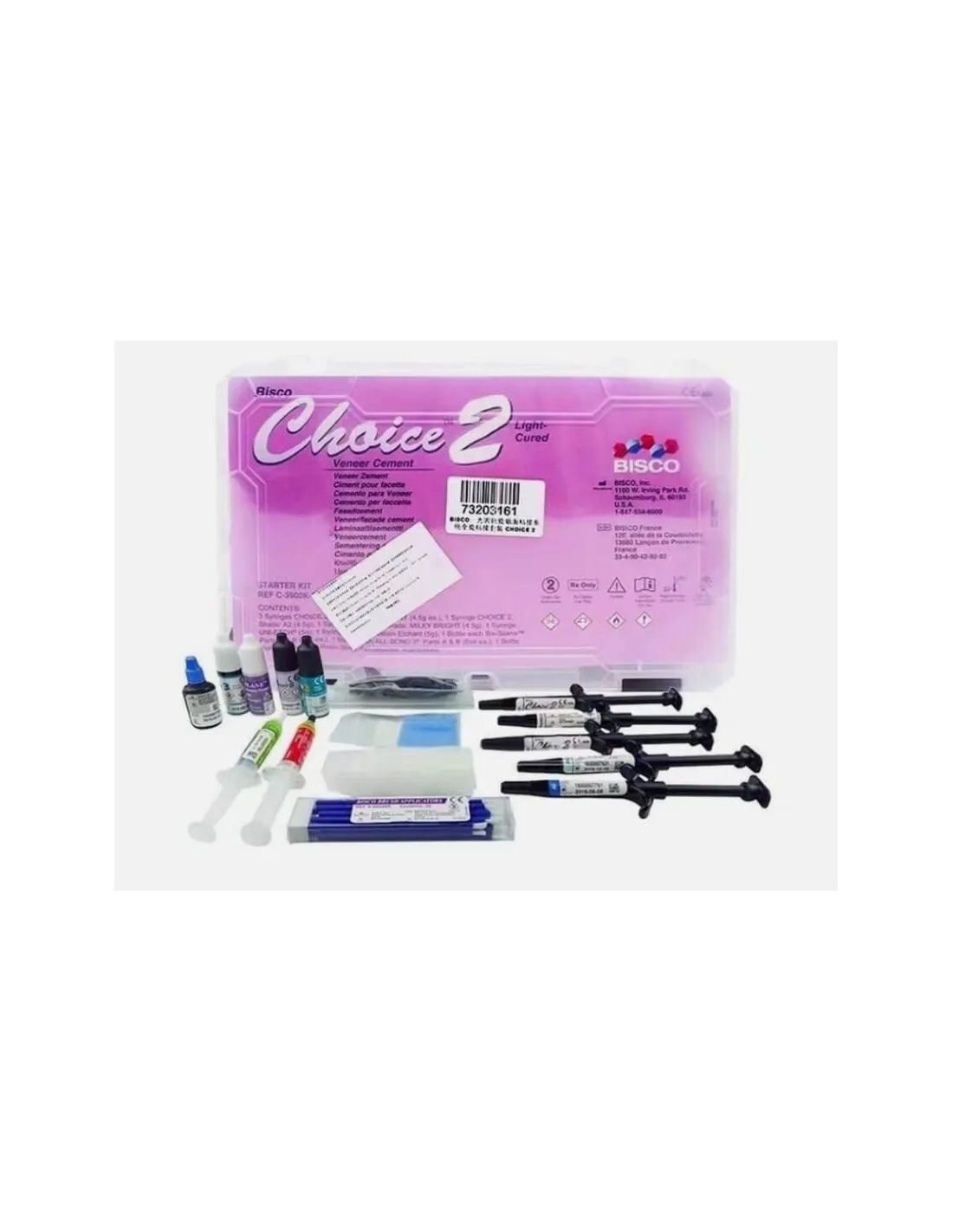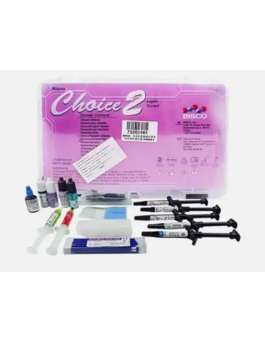 Desmineralizante UNI-ETCH (Ácido fosfórico al 32%) Adhesivo ALL-BOND universal 6 ml D-E Resin (Bonding del diente) NO necesita fotopolimerización. Ácido Fluorhidrico al 9.5% BIS-Silane (Frascos A y B) Porcelain Bonding resin Es un agente especial adhesivo para porcelana (Libre de HEMA) que provee una superficie hidrofóbica que permite el medio de unión a la carilla y la hace más compatible con CHOICE 2. NO necesita fotopolimerización. Pinceles de aplicación del adhesivo y las correspondientes puntas mezcladoras para el HF y el UNI ETCH